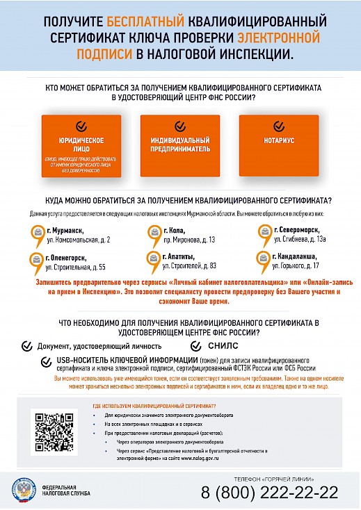 Для этого необходимо обратиться в любую налоговую инспекцию региона, можно также предварительно записаться на прием через сервисы ФНС России «Личный кабинет налогоплательщика» или «Запись на прием в инспекцию» на услугу «Выдача КЭП».