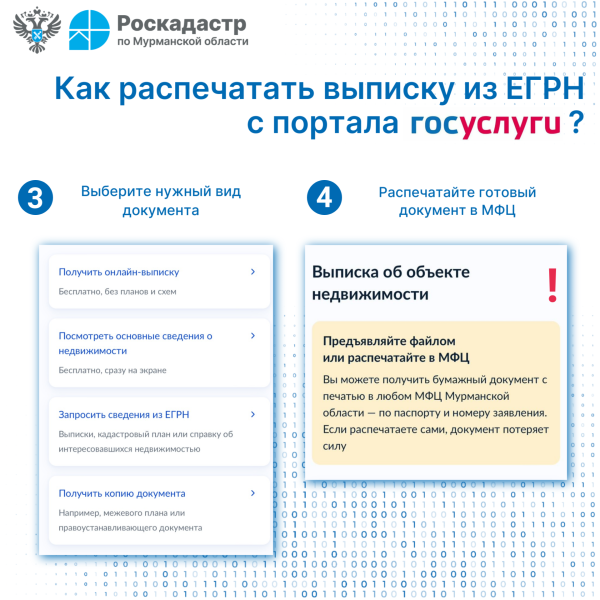 Роскадастр по Мурманской области рассказал, как получить бумажную выписку из ЕГРН по запросу с портала Госуслуг