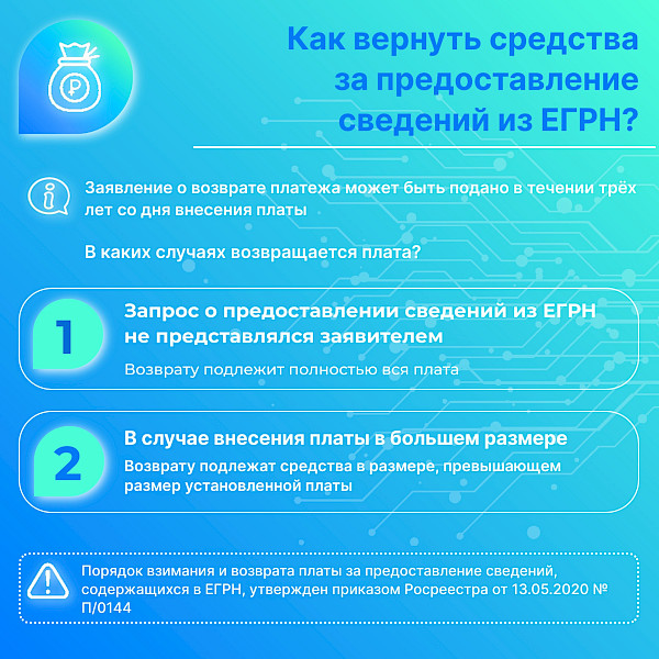 Порядок взимания и возврата платы за предоставление сведений, содержащихся в ЕГРН установлен Приказом Росреестра от 13.05.2020 №П/0144.