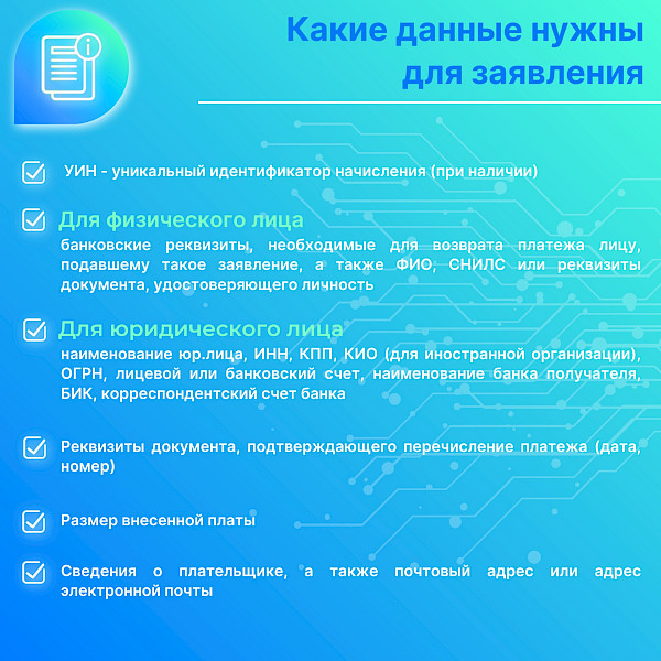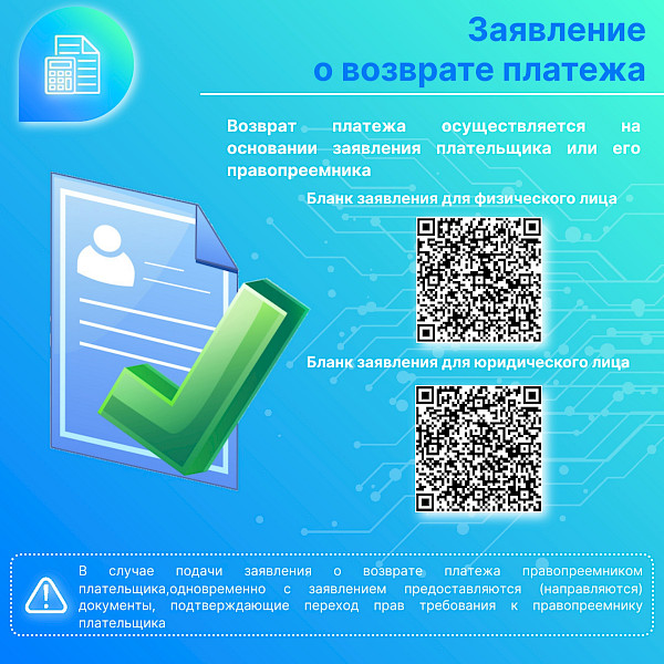 Оформить возврат может лицо, подавшее запрос на предоставление сведений, а также его представитель по доверенности. В случае подачи заявления о возврате платежа правопреемником плательщика одновременно с заявлением представляются (направляются) документы, подтверждающие переход прав требования к правопреемнику плательщика.