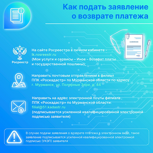 - в электронном виде по адресу электронной почты филиал ППК «Роскадастр» по мурманской области filial@51.kadastr.ru (подписывается усиленной квалифицированной электронной подписью заявителя).