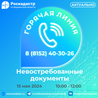 15 мая 2024 года с 10:00 до 12:00 часов эксперты Роскадастра по Мурманской области проведут горячую линию, посвященную вопросам получения невостребованных документов.