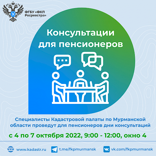 Консультации будут проводиться в период с 4 по 7 октября с 9:00 до 12:00 в офисе региональной Кадастровой палаты по адресу: г. Мурманск, ул. Полярные Зори, д. 44 (окно 4).