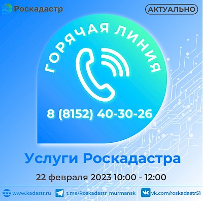 22 февраля 2023 года с 10:00 до 12:00 в Роскадастре по Мурманской области пройдет горячая линия по услугам, оказываемым публично-правовой компанией «Роскадастр» физическим и юридическим лицам.