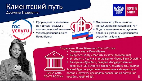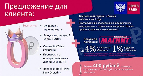 АО "Почта Банк" в рамках оказания социальной поддержки семей с низким уровнем дохода предлагает дополнительные меры поддержки для получателей ежемесячной денежной выплаты на ребенка в возрасте от восьми до семнадцати лет, которые оформили заявление на выплату на счет в АО «Почта Банк».