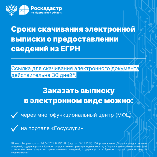 При заказе выписки из ЕГРН в электронном виде электронную версию направят вам на адрес электронной почты в течение 3 дней в виде ссылки на документ.
