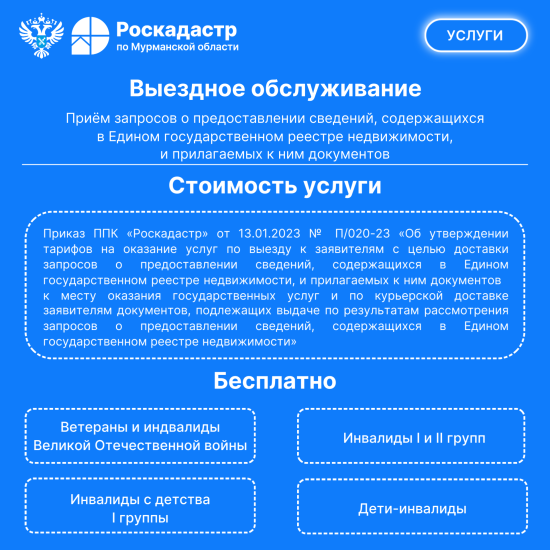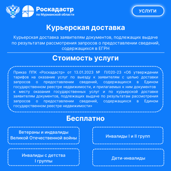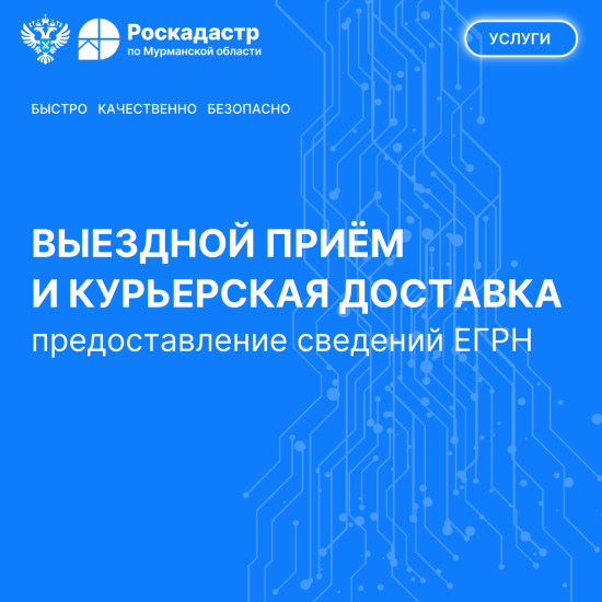 Услуги Роскадастра по Мурманской области: выездной прием запросов на предоставление сведений из Единого государственного реестра недвижимости (ЕГРН) и курьерская доставка готовых документов.