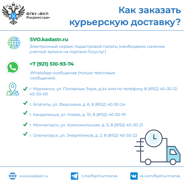 Заказать курьерскую доставку документов можно с помощью электронного сервиса Кадастровой палаты svo.kadastr.ru (необходимо наличие учетной записи на портале Госуслуг), а также в офисах Кадастровой палаты или по телефону: