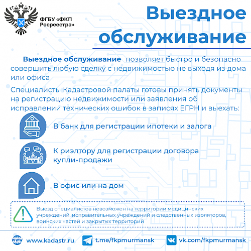 Напомним, выездное обслуживание позволяет быстро и безопасно совершить любую сделку с недвижимостью не выходя из дома или офиса. Специалисты Кадастровой палаты готовы принять документы на регистрацию недвижимости или заявления об исправлении технических ошибок в записях ЕГРН и выехать: