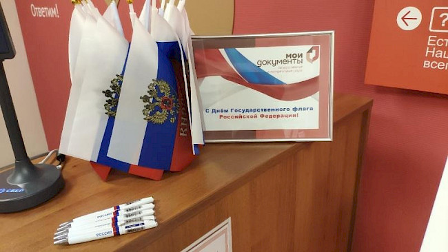 В честь Дня государственного флага Российской Федерации отделение ГОБУ «МФЦ МО» по г. Полярные Зори проводит акцию «День флага моей страны». Каждому юному посетителю в офисе МФЦ дарят флажок, ребятам постарше - шариковую ручку с надписью «Россия», как символ напоминания об общенациональном празднике.