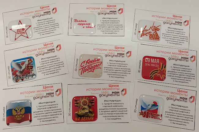 Накануне 80-й годовщины Победы в отделении ГОБУ «МФЦ МО» по Ковдорскому округу проходит акция «Цени истории моменты». Все заявители получают в подарок 3D-стикеры с праздничной символикой Победы. Стикер можно прикрепить на обложку паспорта, чехол телефона, сумку или верхнюю одежду. Это отличный способ напомнить о значимости дня, когда завершилась Великая Отечественная война, выразить свою благодарность и уважение тем, кто сражался за нашу Родину, а также почувствовать атмосферу праздника.