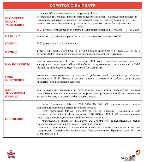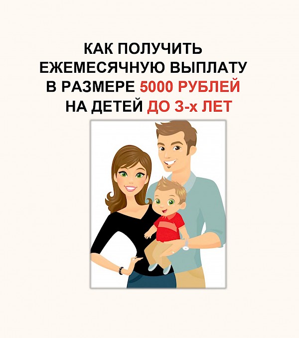 В соответствии с Указом Президента РФ расширено право семей на ежемесячную выплату 5 тыс. рублей, которая с апреля по июнь предоставляется на детей до трех лет. Теперь эти средства могут получить не только семьи, имеющие право на материнский капитал, но и вообще все семьи, родившие или усыновившие первого ребенка с 1 апреля 2017 года до 1 января 2020 года.