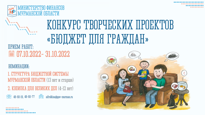 Стартует ежегодный конкурс творческих проектов «Бюджет для граждан», который проводится Министерством финансов Мурманской области в целях повышения заинтересованности населения Мурманской области в вопросах бюджетной и финансовой грамотности.
