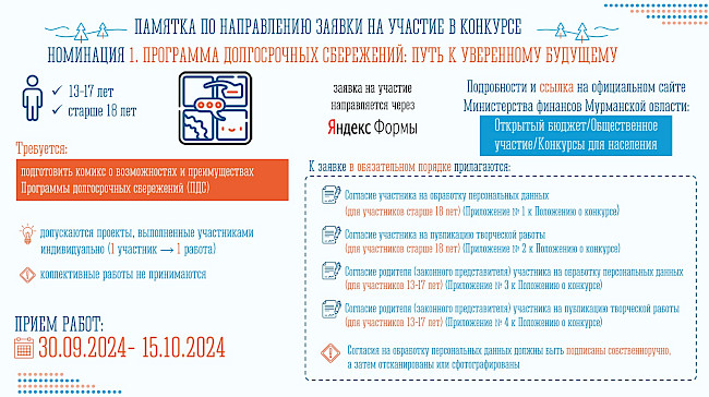 С информацией о сроках проведения, условиях конкурса, а также Положением о конкурсе творческих проектов «Бюджет для граждан» в 2024 году, можно ознакомиться на сайте Министерства финансов Мурманской области в разделе «Открытый бюджет/Общественное участие/Конкурсы для населения/Конкурс творческих проектов «Бюджет для граждан». 2024 год»