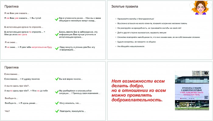 Сотрудники, занятые на очном обслуживании заявителей, разбирали ситуации из собственной практики взаимодействия с клиентами: выявляли наиболее распространённые ошибки в действиях специалистов при разрешении нестандартных ситуаций, определяли способы снижения рисков возникновения конфликтов, знакомились с приёмами работы с эмоциональным состояние своим и заявителей.