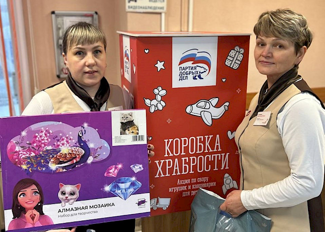 Сотрудники отделения по Терскому району наполнили «Коробку храбрости» игрушками, наборами для рисования и вышивания, алмазной мозаикой и другими подарками, которые затем будут переданы в медицинские учреждения.