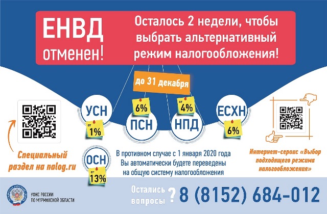 У предпринимателей Мурманской области на ЕНВД осталось всего 2 недели, чтобы определиться, на какой же режим налогообложения перейти с 2021 года. От выбора режима зависит уровень налоговой нагрузки, а также необходимость сдавать отчетность в налоговые органы.