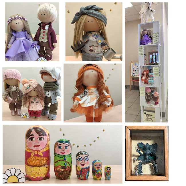 Специалисты по работе с заявителями предоставили для выставки вручную расписанную семью замечательных матрешек, невероятных тряпичных мягконабивных кукол, одетых с иголочки по последней моде, фигурку фантастического существа, сделанного из полимерной глины.